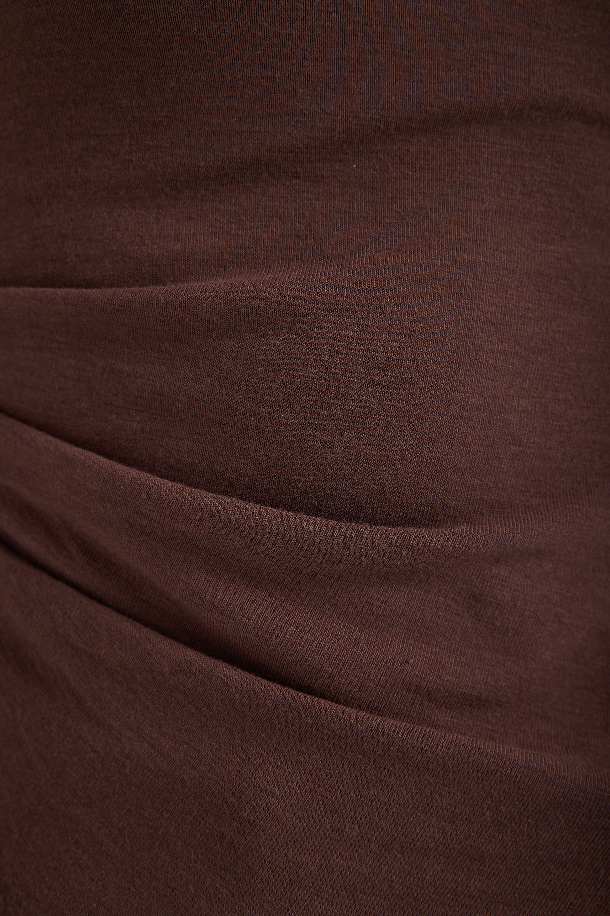 The Monlicia Aura Top captures effortless sophistication with its asymmetric neckline and soft draped detailing at the left waist. Crafted in a deep brown hue, this lightweight jersey design flatters the silhouette while offering all-day comfort and stretch.
