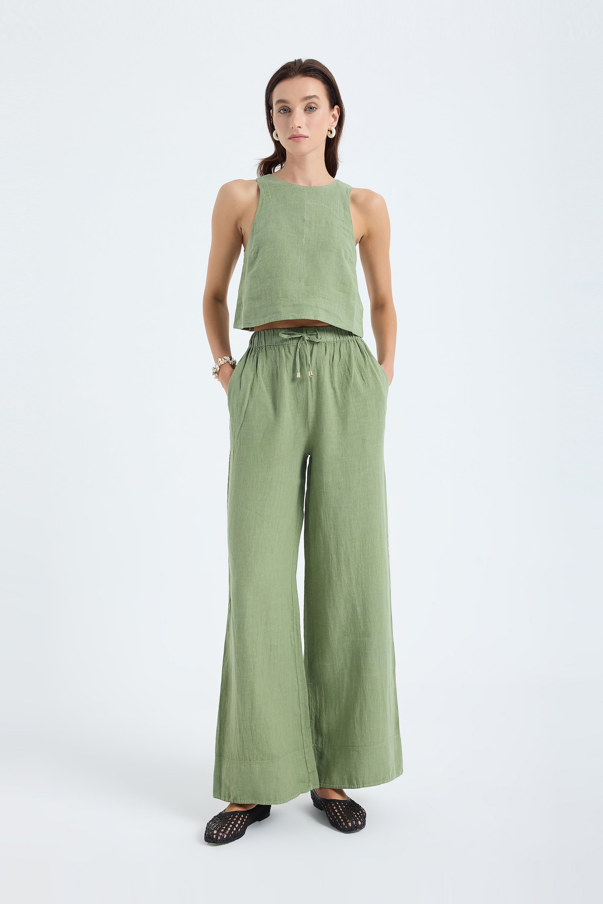 Crafted from 100% premium linen, these wide-leg pants offer a breathable and elegant silhouette perfect for warm days. The elastic waistband with drawstring ensures a comfortable, adjustable fit, while the lightweight natural fabric provides effortless movement and timeless style.
