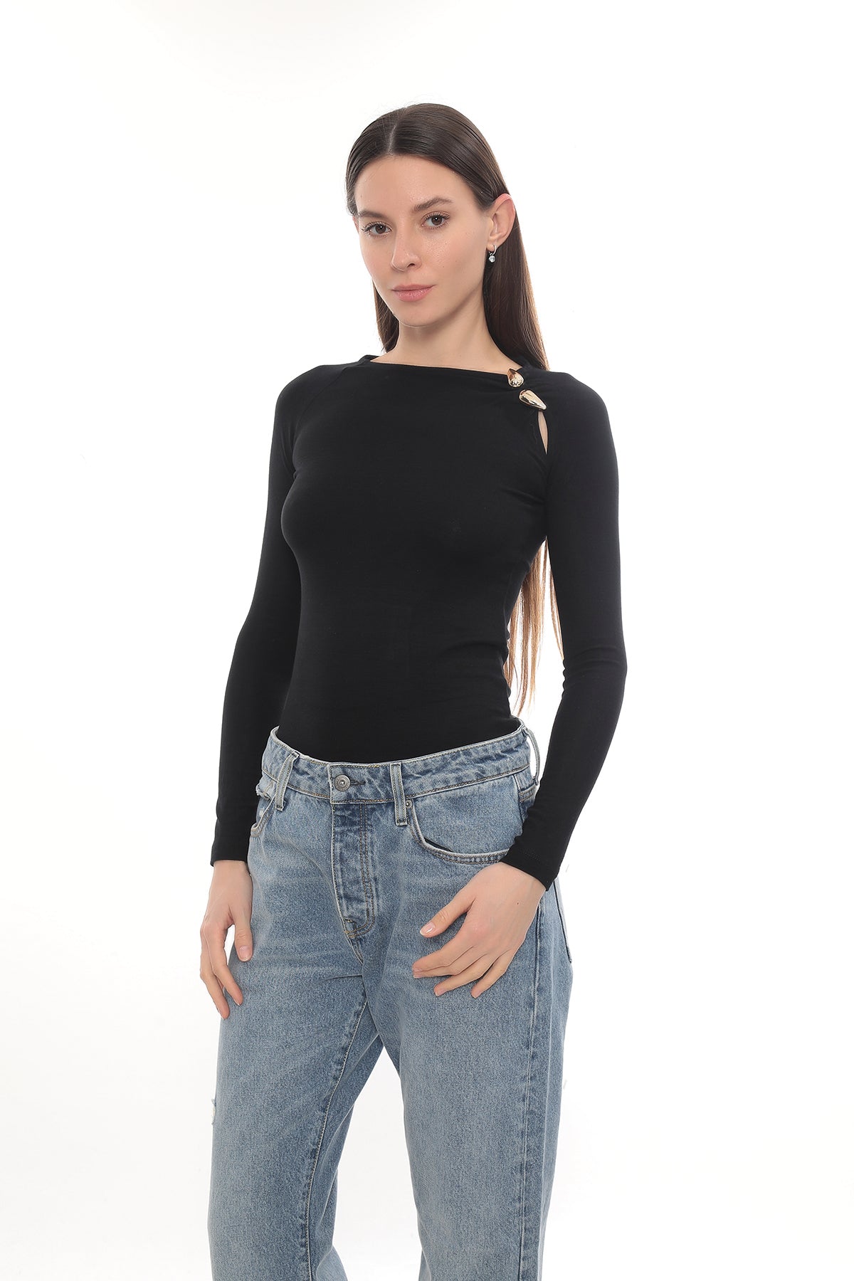 Designed to flatter the silhouette, this long sleeve stretch top features a sleek cutout neckline finished with an elegant gold-tone detail. The body-hugging fit highlights the natural shape while maintaining a refined, modern aesthetic.