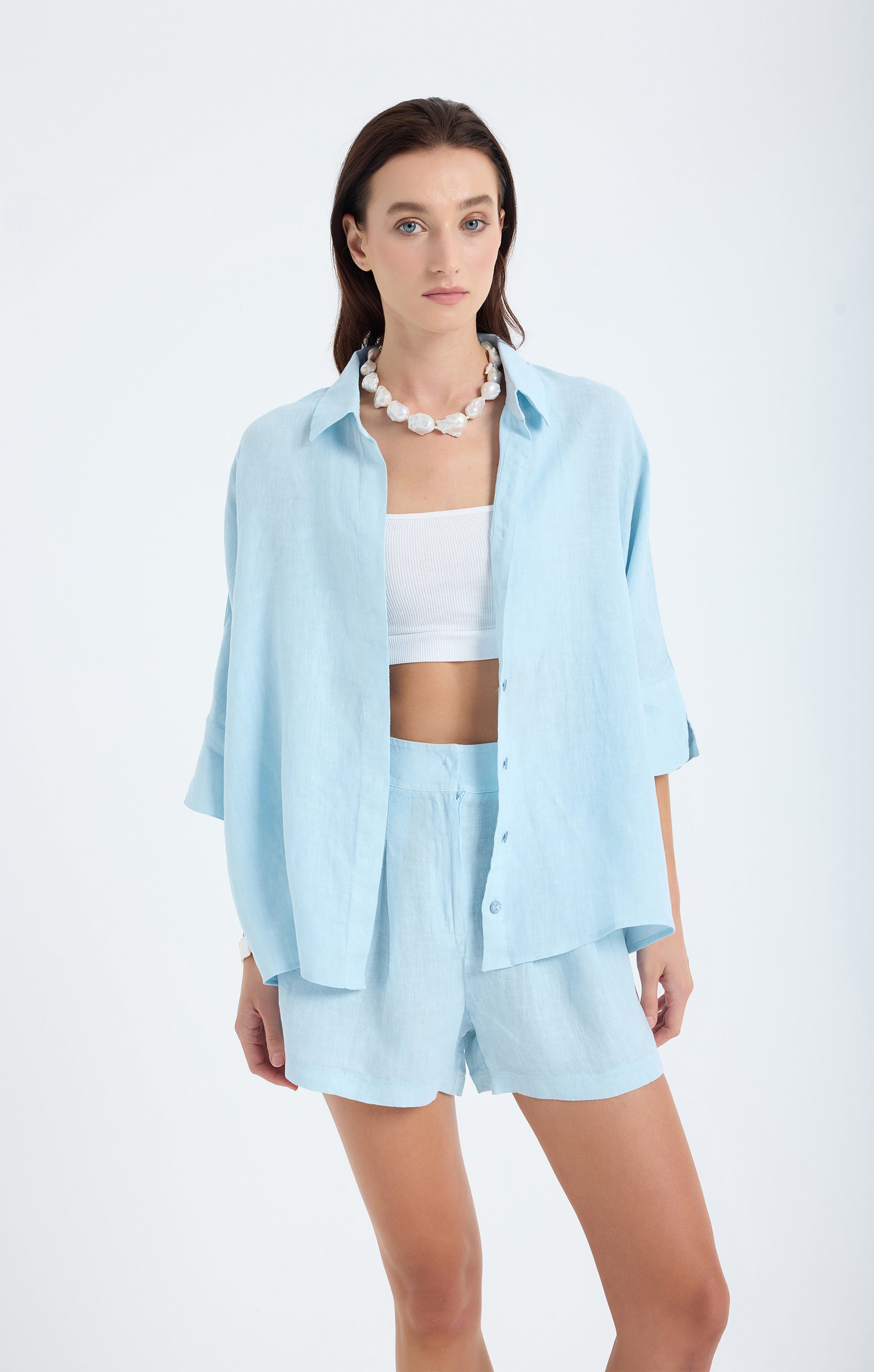 Crafted from 100% pure linen, this oversized shirt offers a timeless balance of comfort and sophistication. Its relaxed fit and lightweight texture make it perfect for effortless layering throughout all seasons. Designed with a classic button-up front, dropped shoulders, and a flowy silhouette, it provides breathable elegance whether worn open over a top or tucked into trousers.