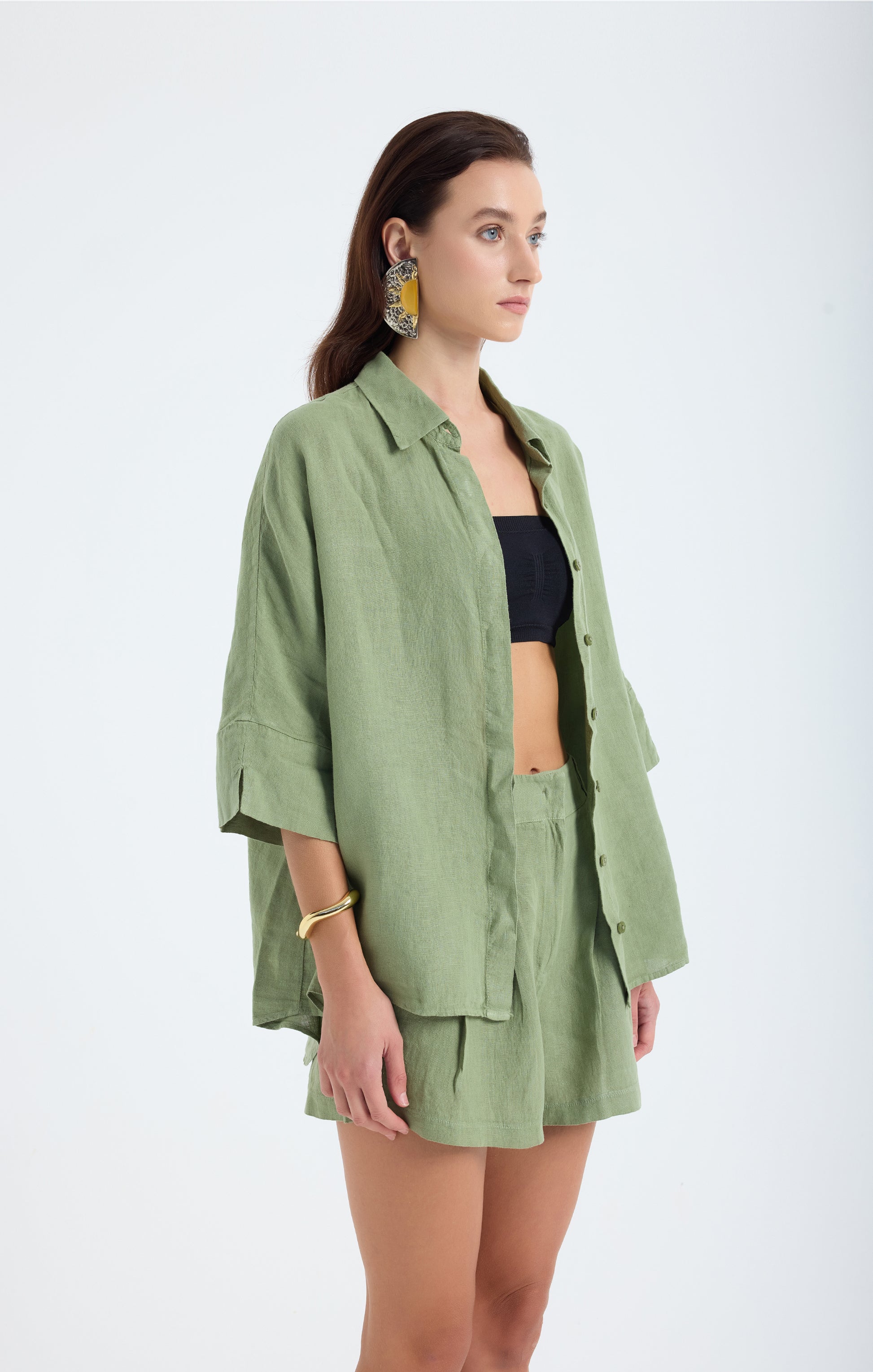 Crafted from 100% pure linen, this oversized shirt offers a timeless balance of comfort and sophistication. Its relaxed fit and lightweight texture make it perfect for effortless layering throughout all seasons. Designed with a classic button-up front, dropped shoulders, and a flowy silhouette, it provides breathable elegance whether worn open over a top or tucked into trousers.