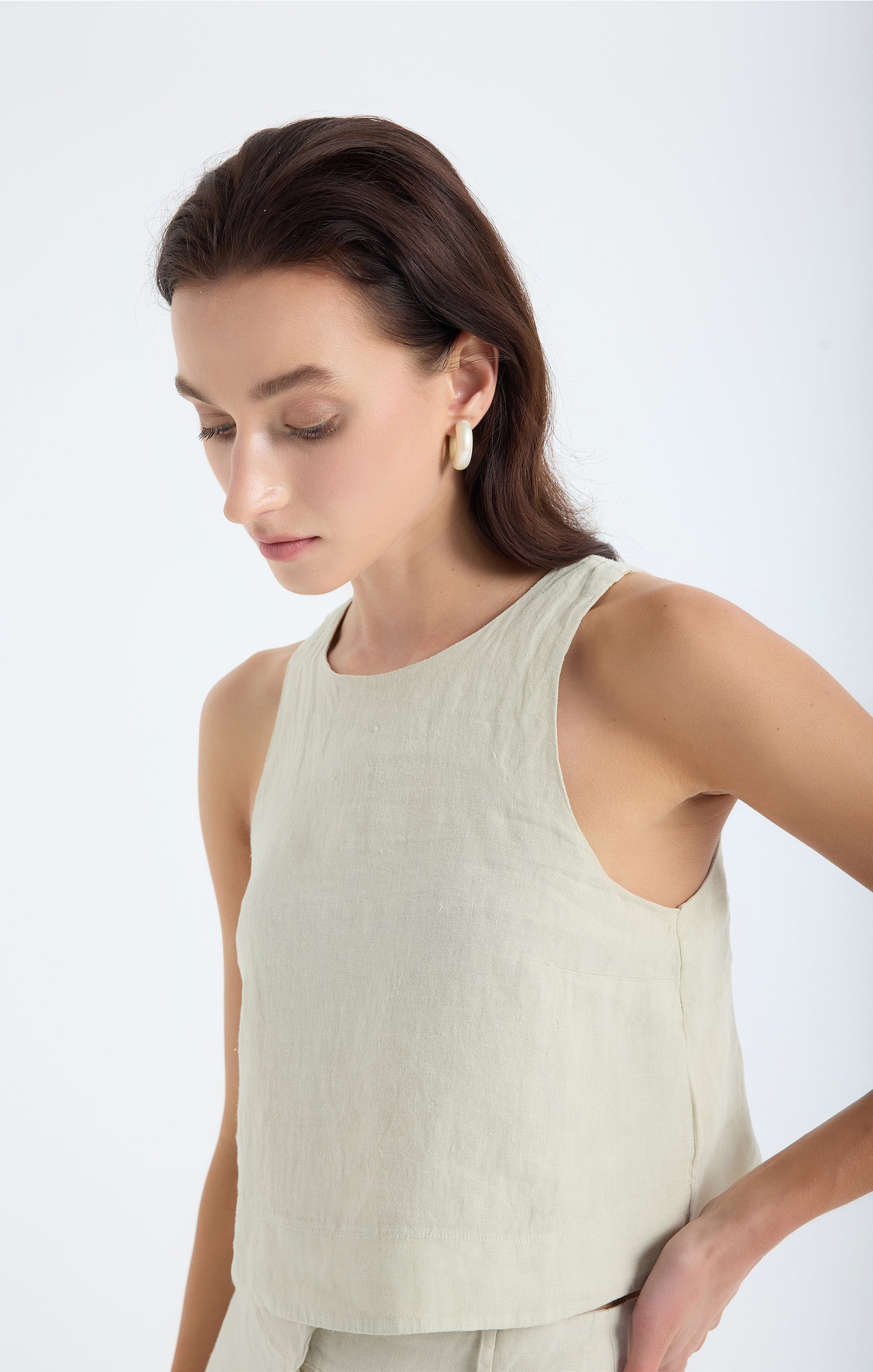 Crafted from 100% pure linen, this sleeveless crop top embodies timeless simplicity and effortless elegance. Designed with a structured yet relaxed silhouette, it highlights the natural beauty of linen while ensuring breathability and comfort on warm days.