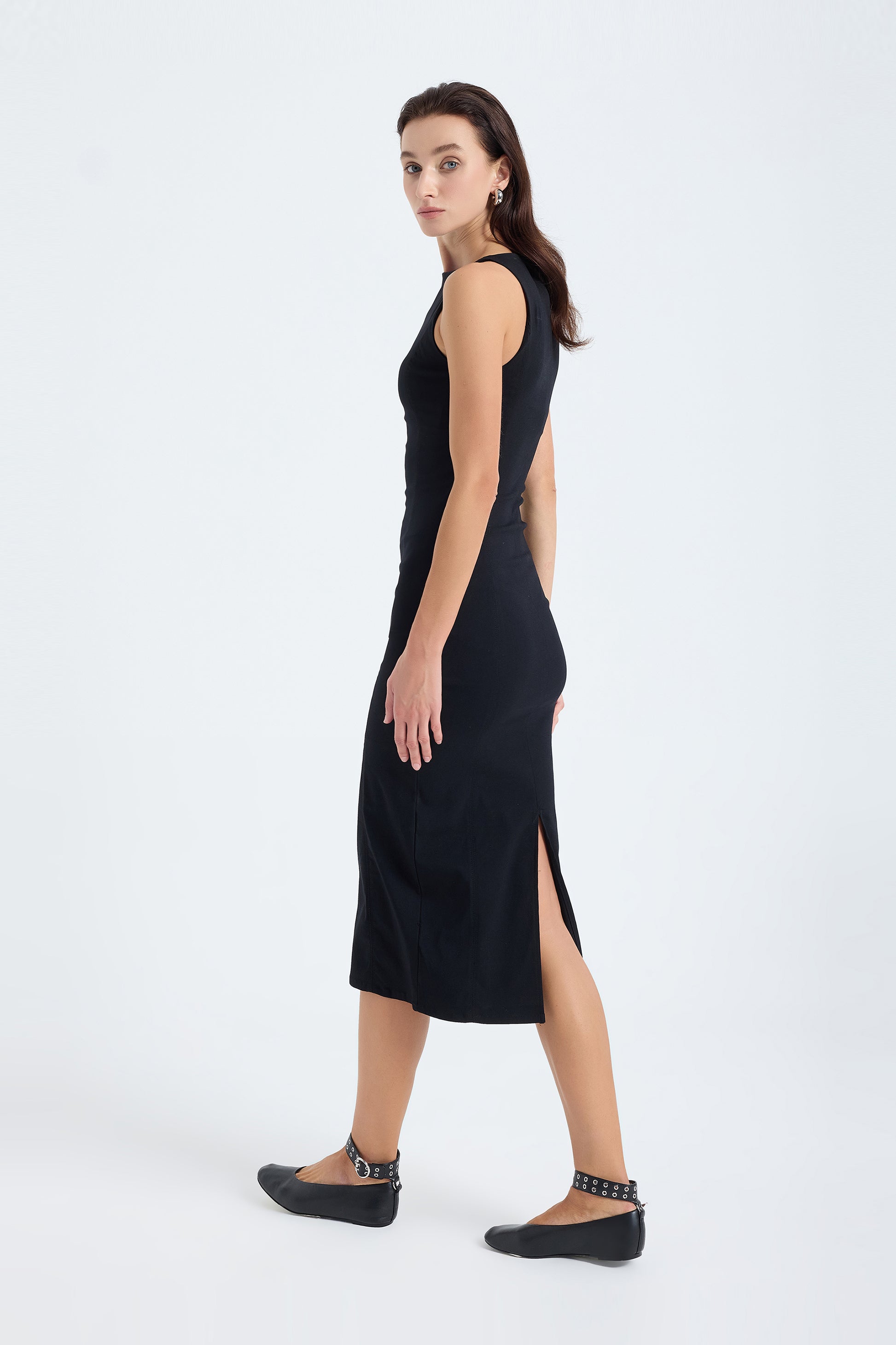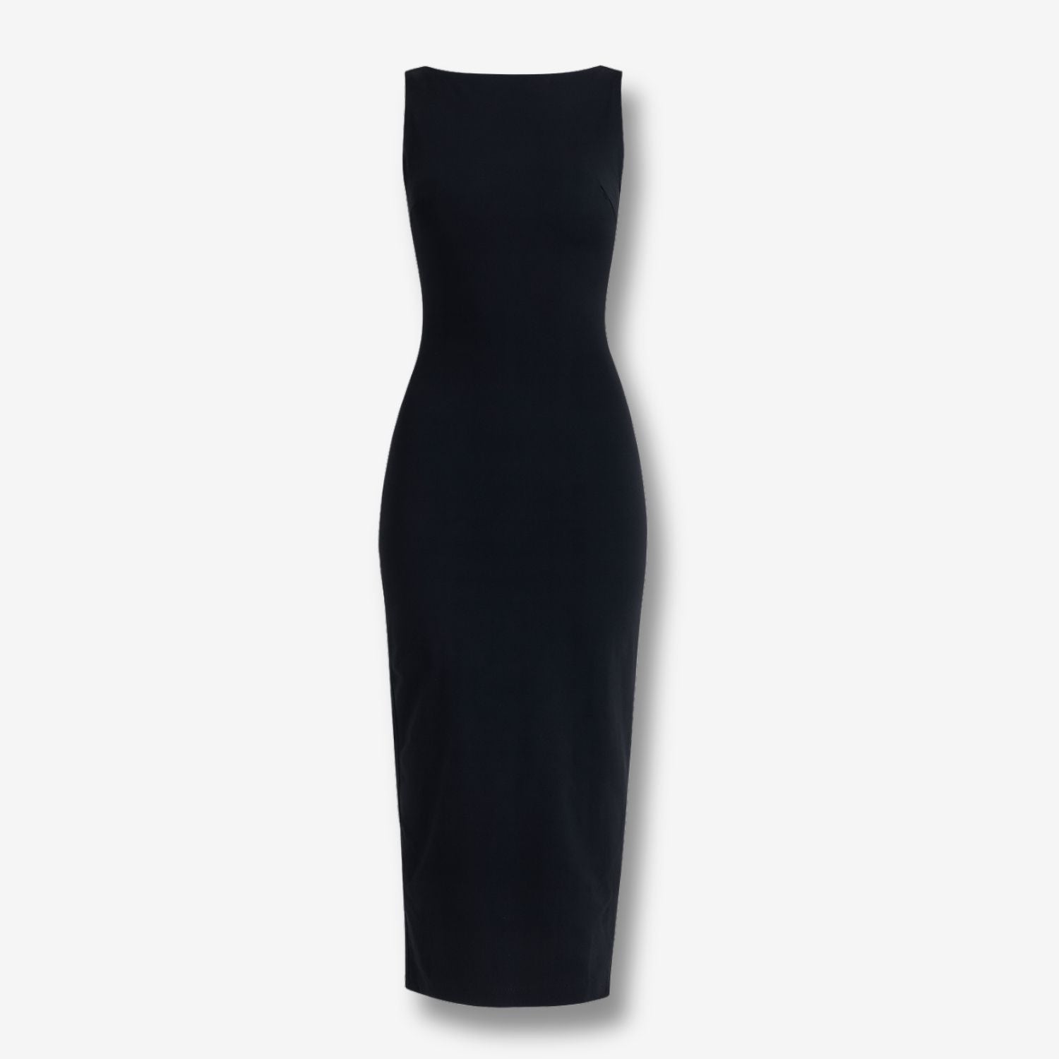 The structured square neckline and sleeveless design give a contemporary edge, while the back slit ensures effortless movement. This wardrobe staple transitions seamlessly through the seasons pair with sandals in summer or boots and a coat in winter.
